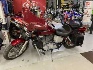 This is a nice bike for a first cruiser. Rides smooth on the highway, handles well on the twisties. This is the bike I used for the advanced rider course, and it sailed through. It's quiet, so it won't piss off the neighbors when you warm it up (it's carbed.) It is reliable, no down time. Just hop on, push the starter button and go. Not a lot of gadgets to go wrong, but you do need to track mileage because their is no fuel gauge (there is a reserve tank with .7 gals to get you to the station.)